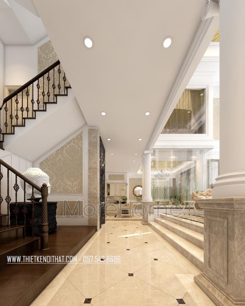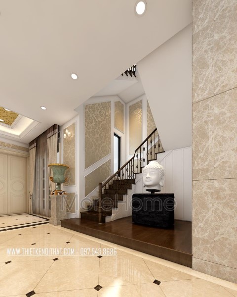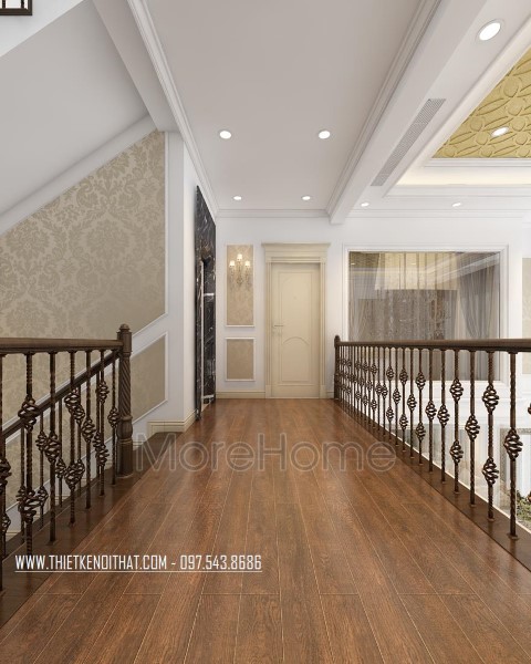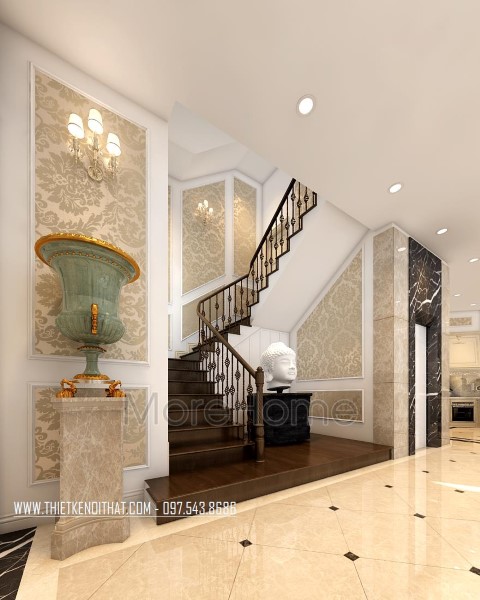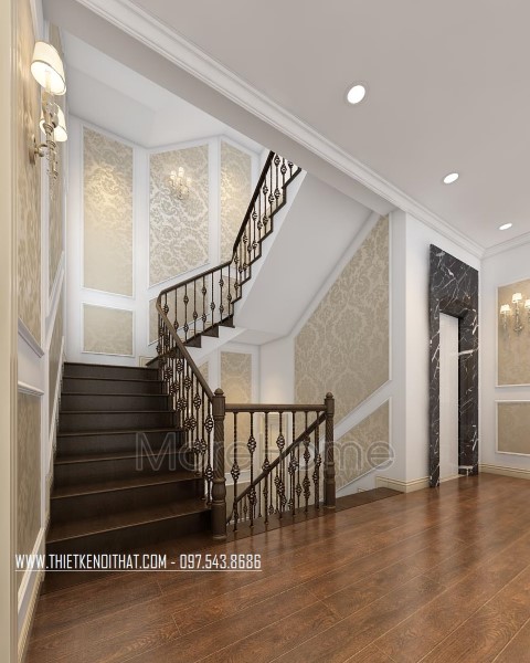 Mẫu cầu thang gỗ tân cổ điển tại biệt thự Quảng Ninh được thiết kế và thi công từ gỗ óc chó tự nhiên, mang lại sự sang trọng, lịch thiệp và giá trị sử dụng lâu dài mà không lo mối mọt.