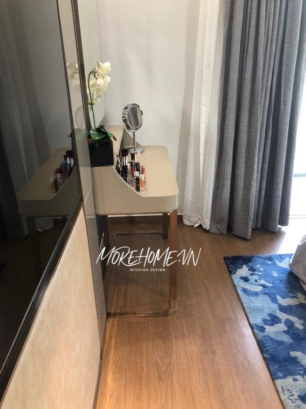 Mẫu thực tế sản phẩm bàn trang điểm hiện đại do Morehome sản xuất, với phần mặt bàn bằng gỗ công nghiệp màu be kết hợp chân bàn bằng inox uốn cong lạ mắt