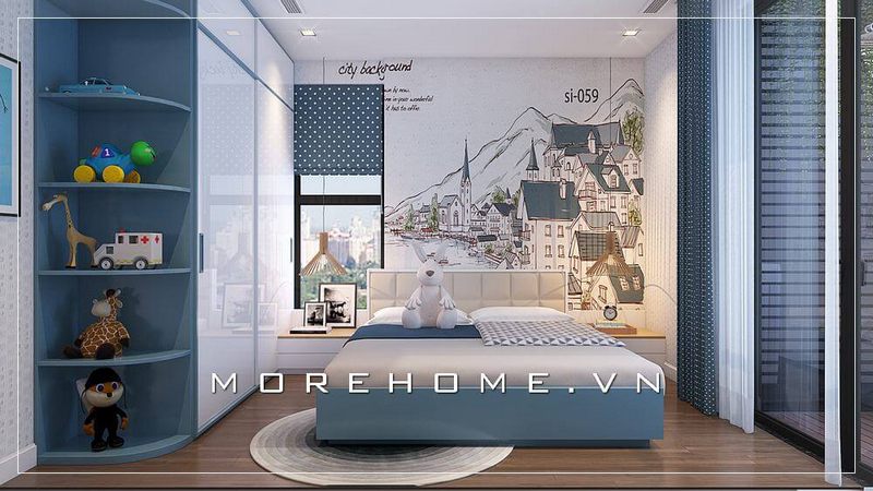 . Thiết kế nội thất phòng ngủ hiện đại cho bé trai bằng cách sử dụng tranh dán tường thành phố sẽ tạo nên cảm giác năng động và cá tính hơn bao giờ hết.